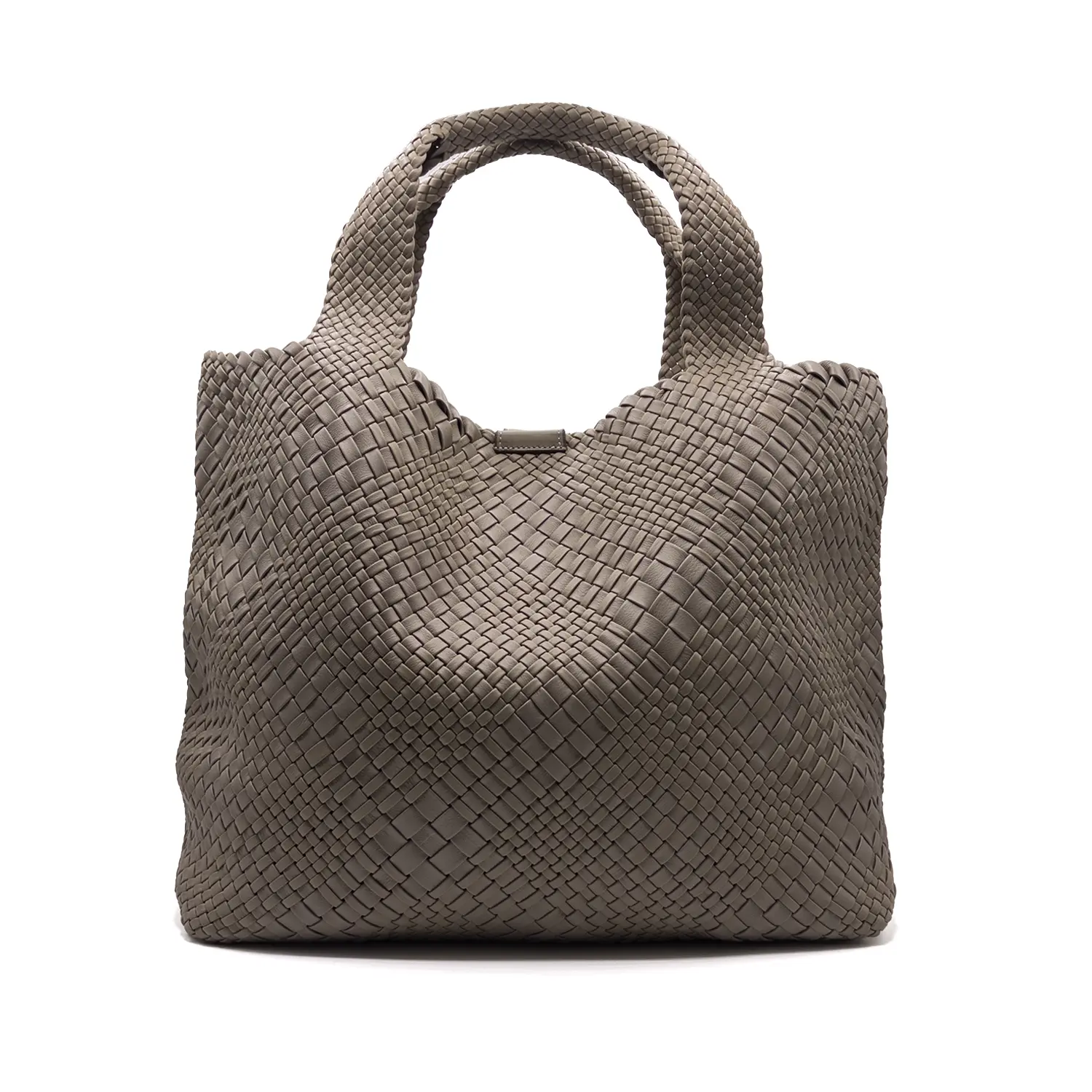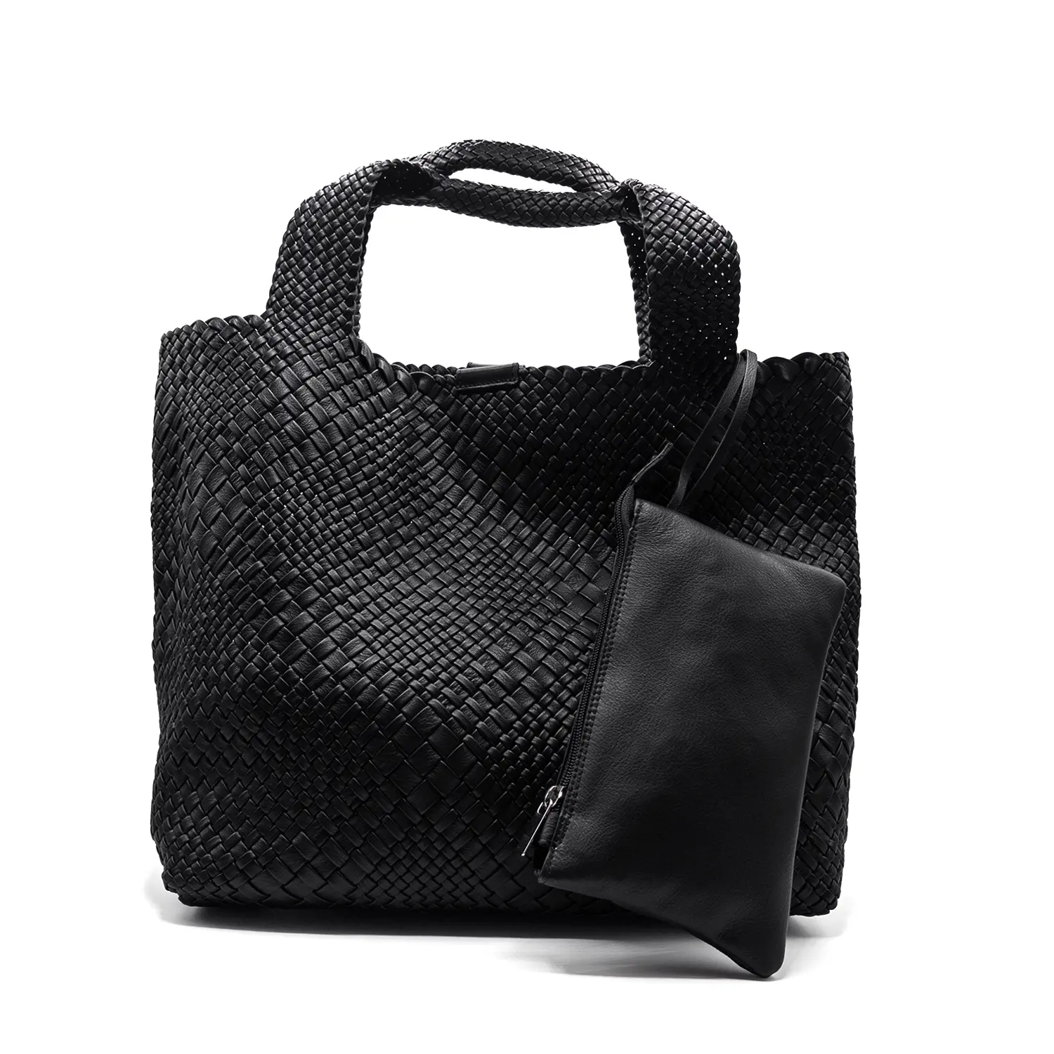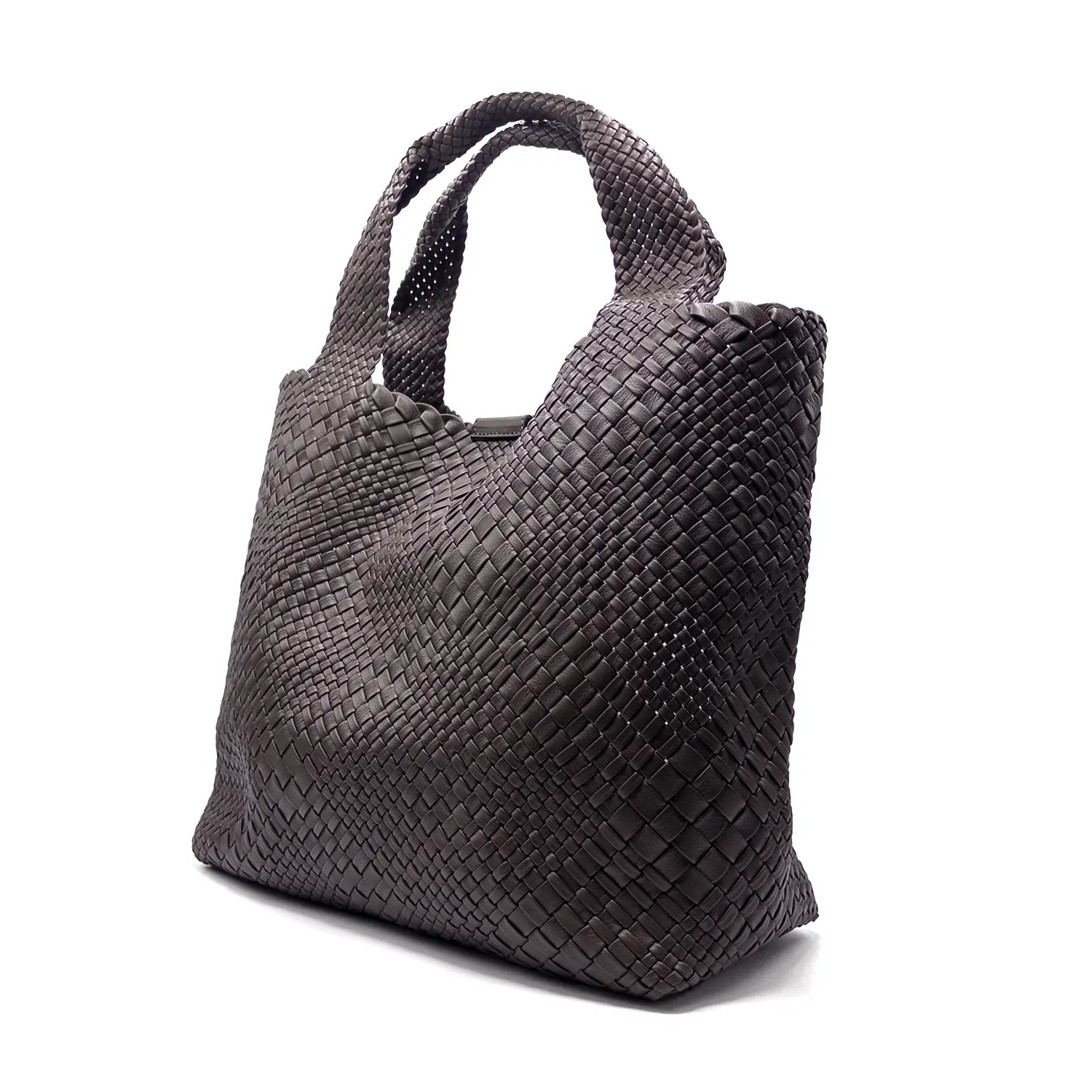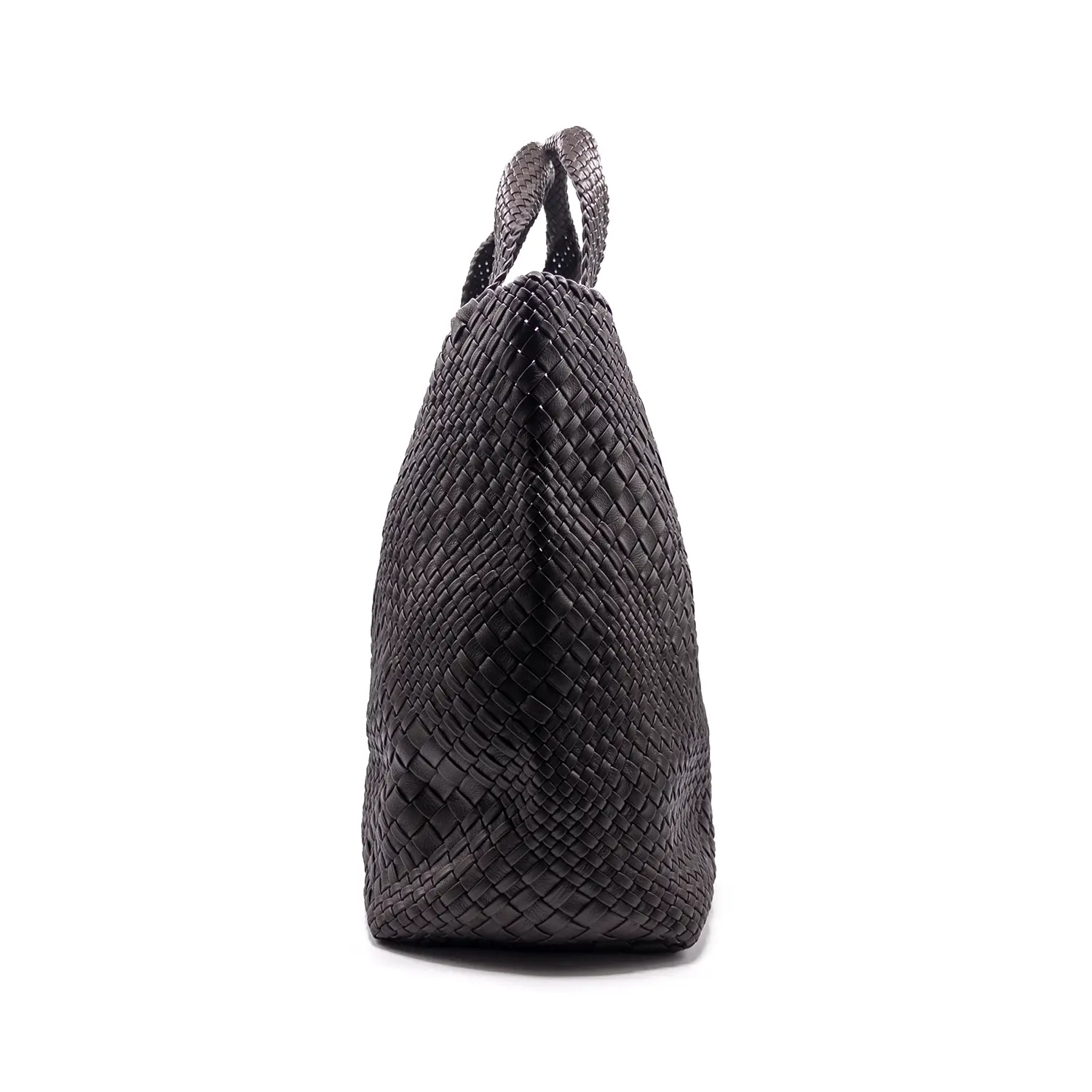 Hand-woven calfskin tote bag with two top handles. It features one internal calfskin zipped pouch. Metal clasp closure.