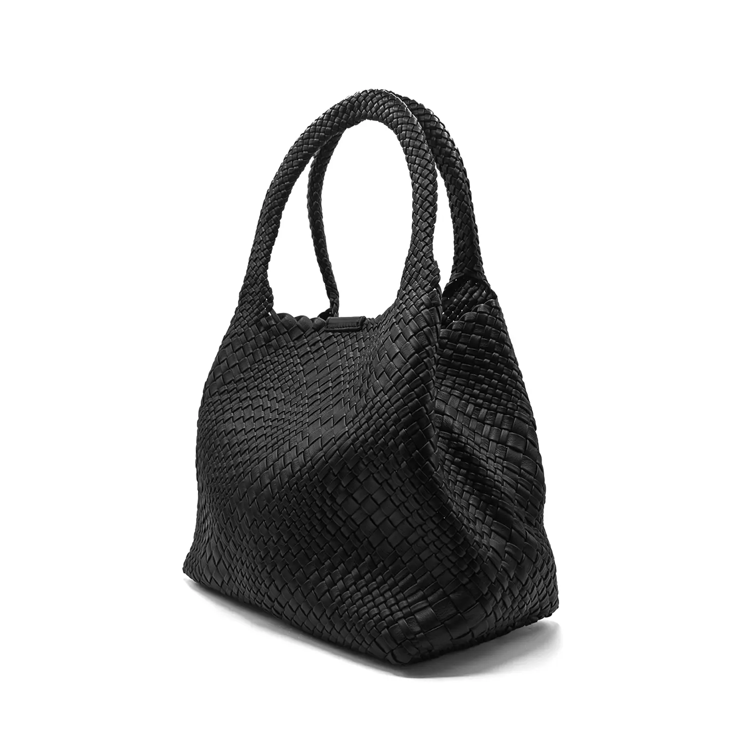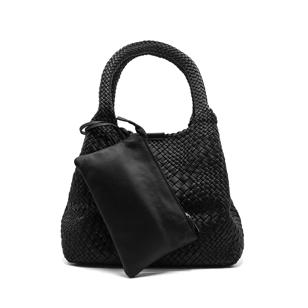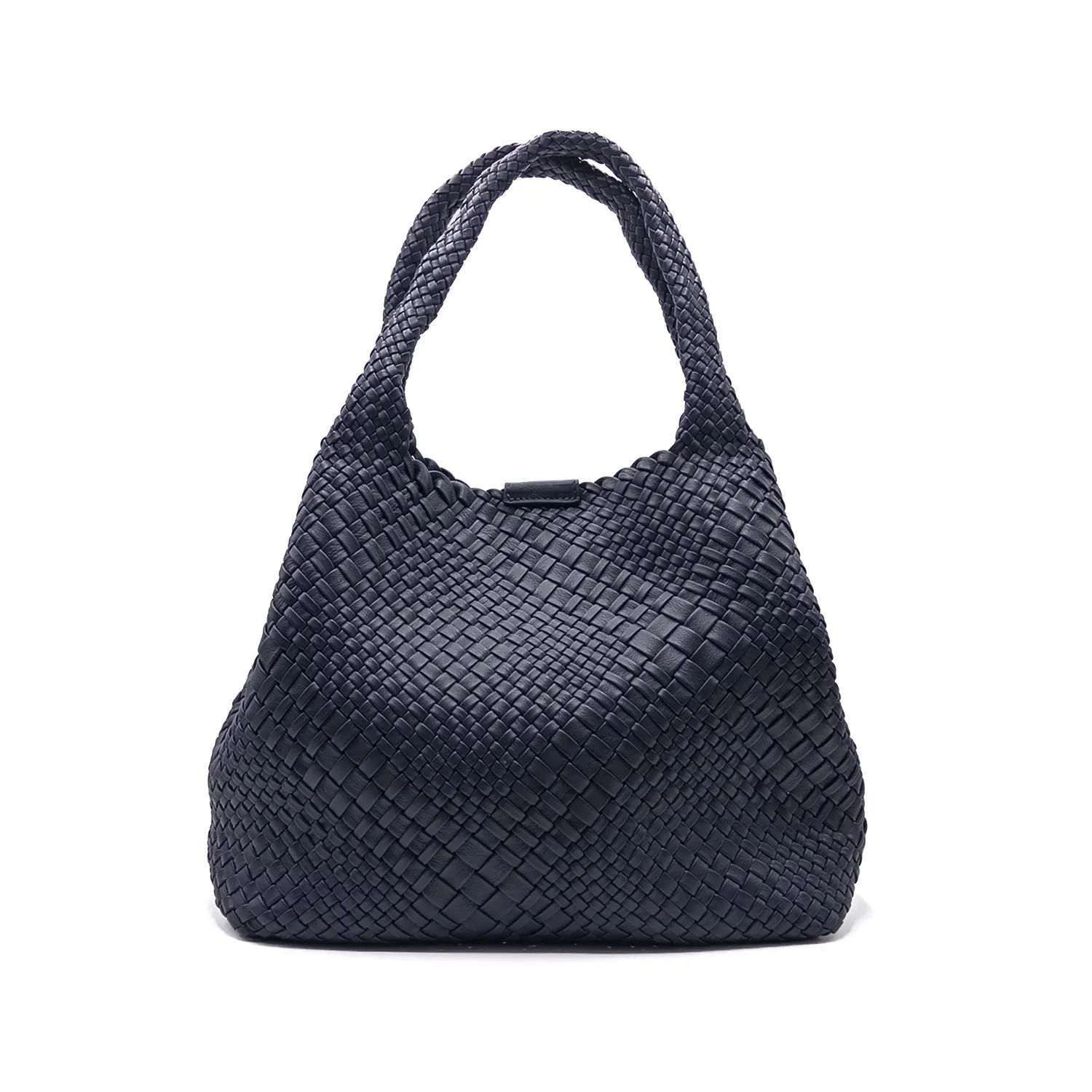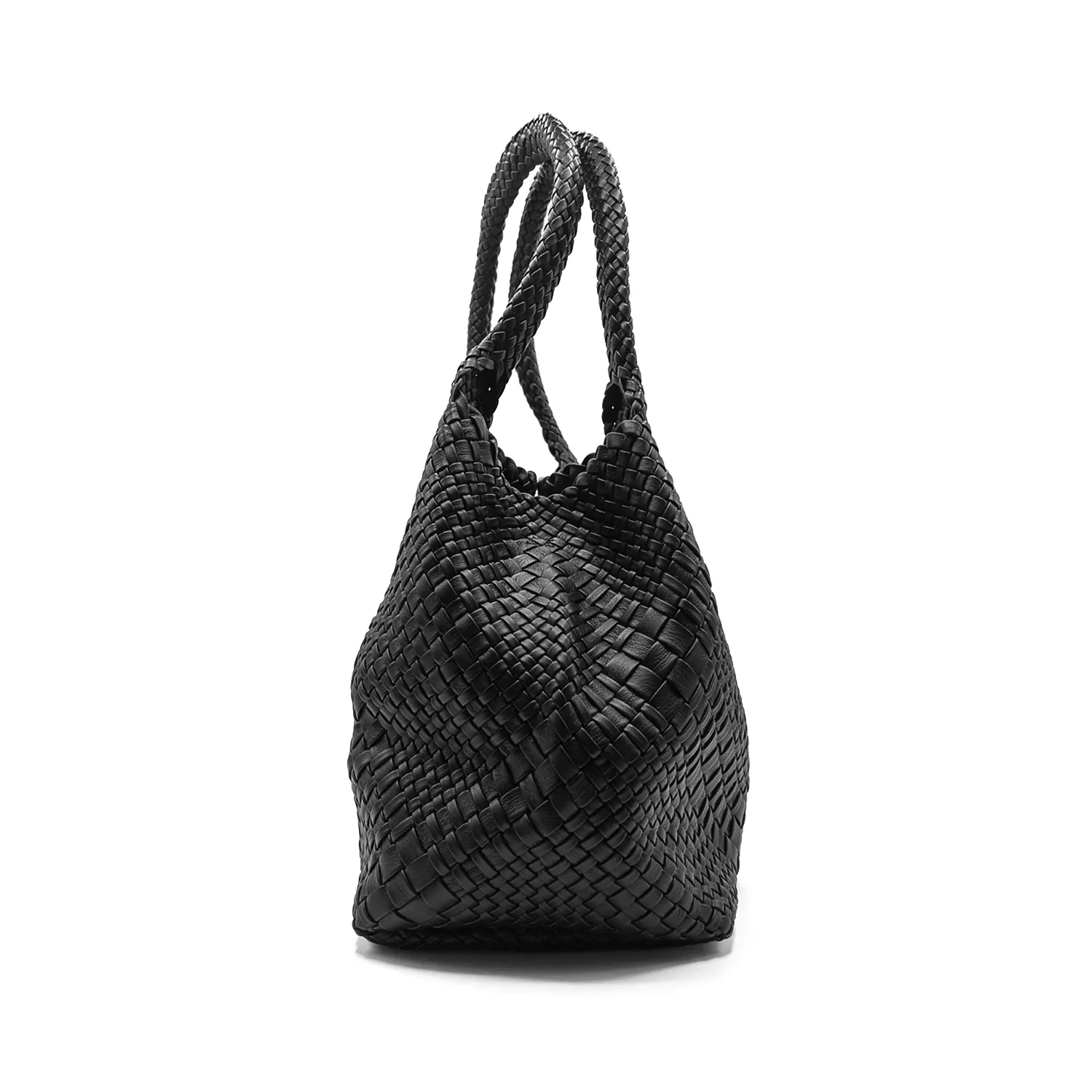 Hand-woven calfskin tote bag with two top handles. It features one internal calfskin zipped pouch. Metal clasp closure.