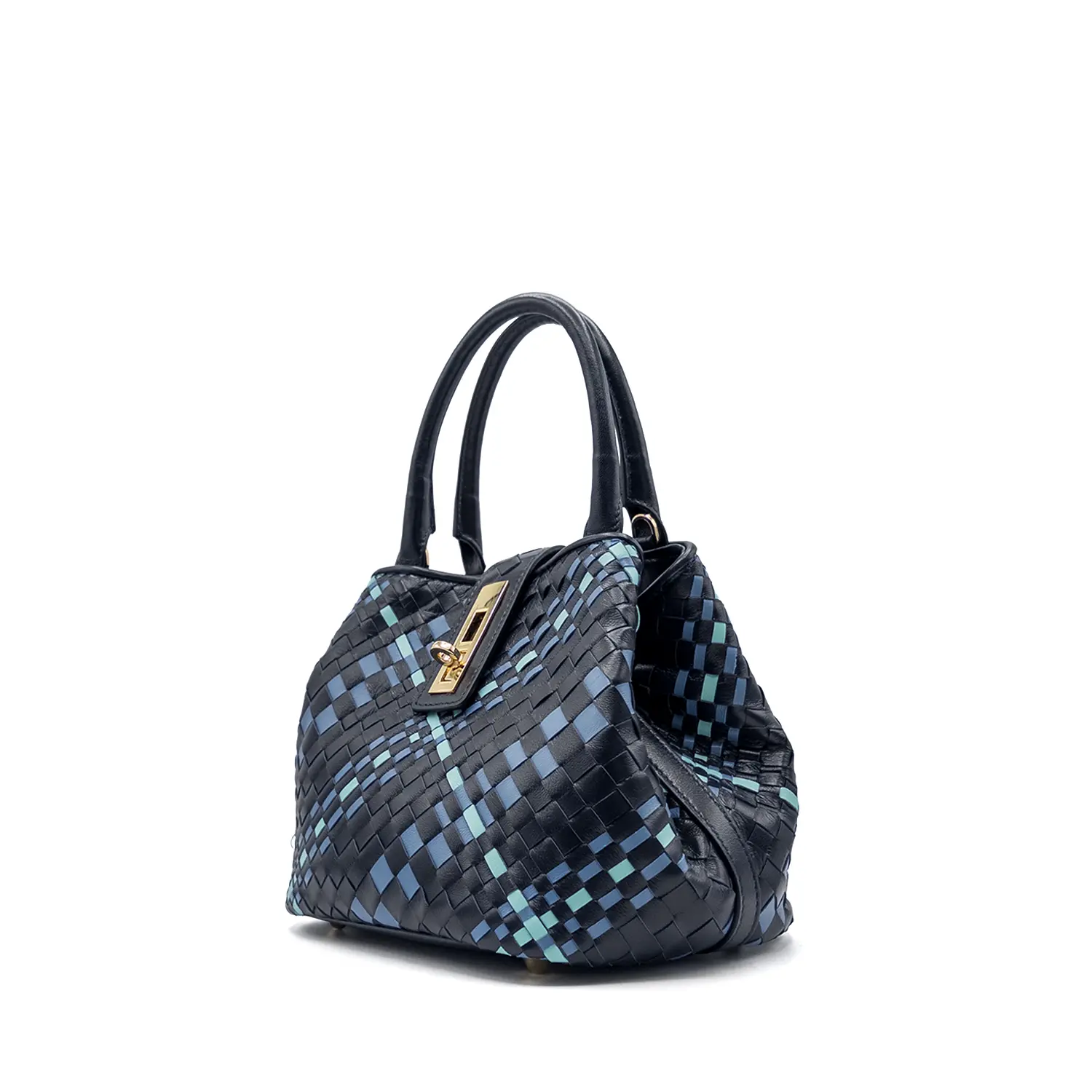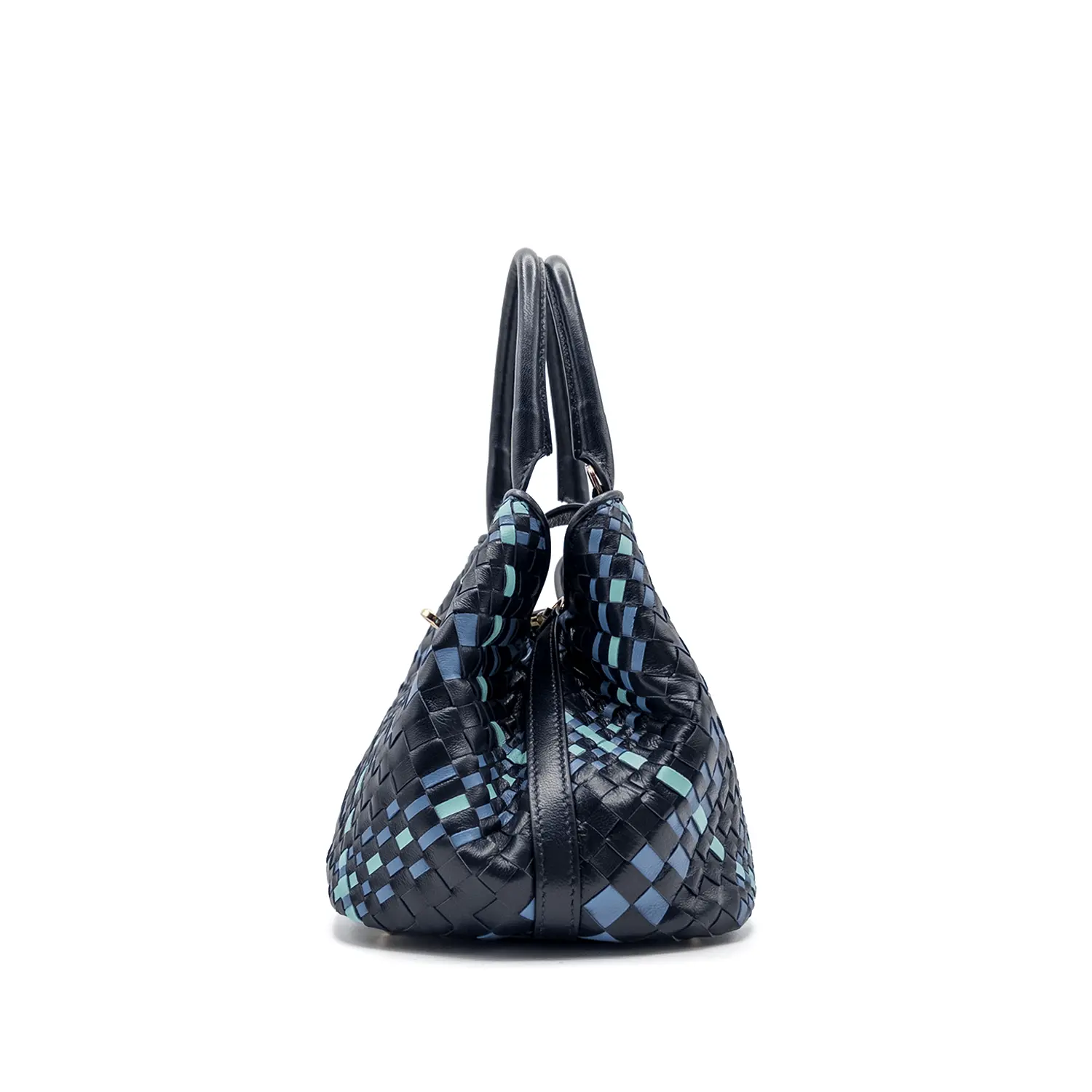 Calfskin top handle bag with two leather handles and detachable leather strap. It features one internal zipped pocket and one internal flat pocket. Metal clasp closure.