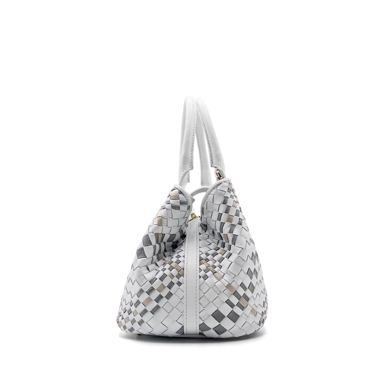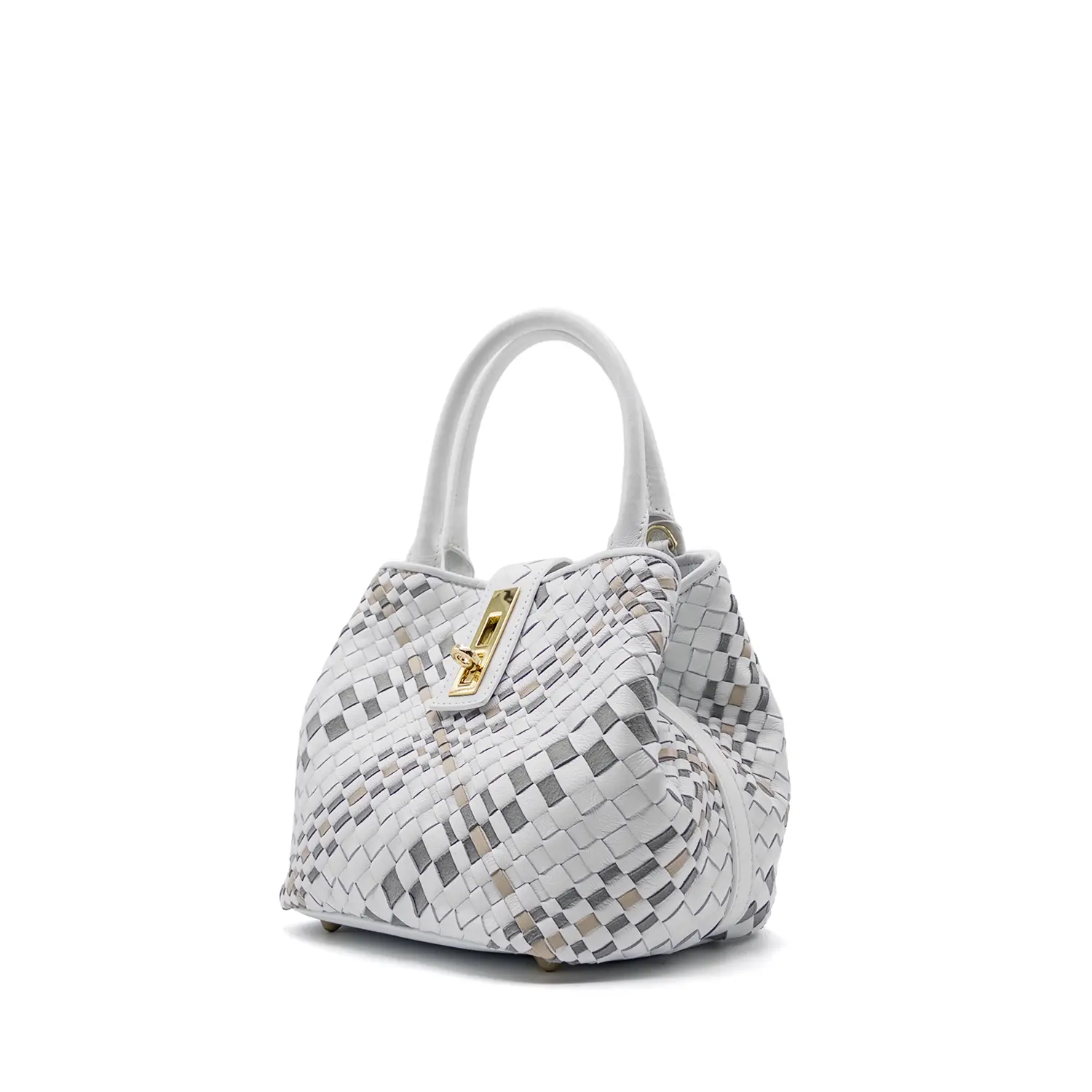 Calfskin top handle bag with two leather handles and detachable leather strap. It features one internal zipped pocket and one internal flat pocket. Metal clasp closure.