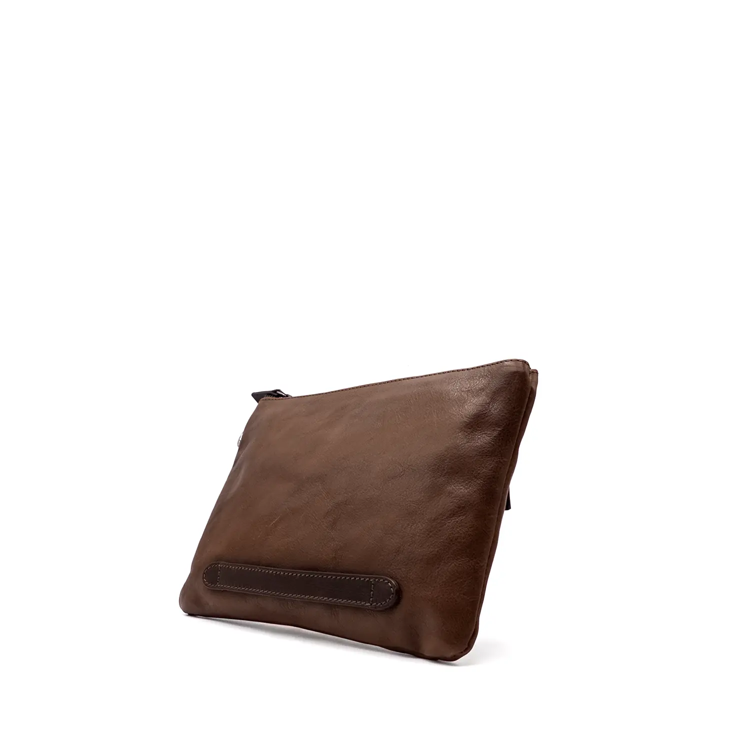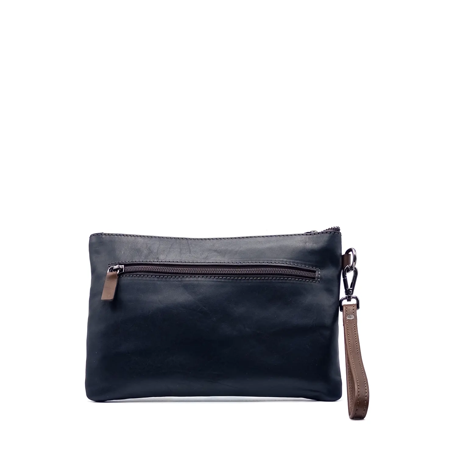Calfskin clutch with detachable wristlet strap. It features one external zipper pocked and two internal flat pockets. Zipper closure.