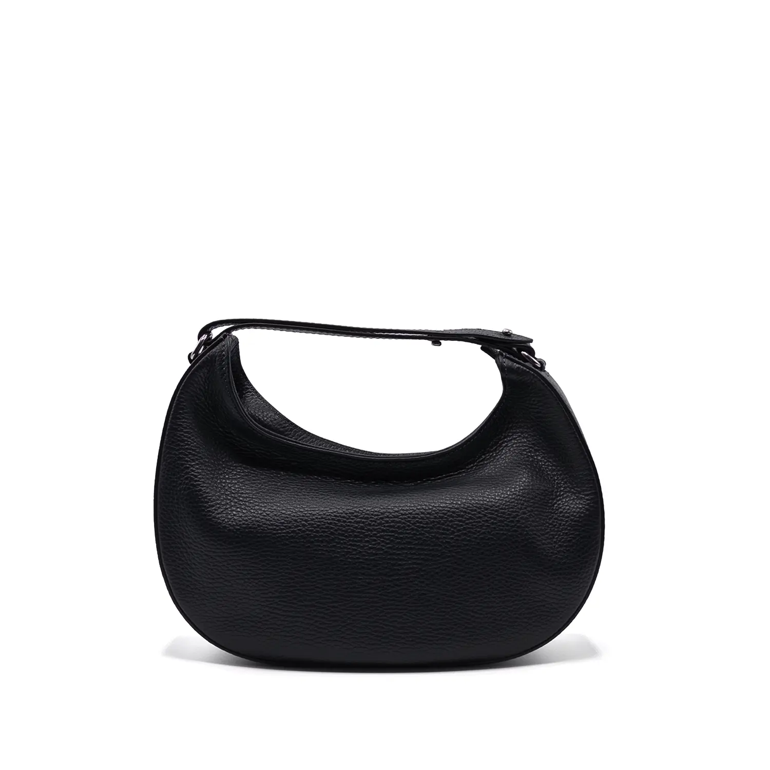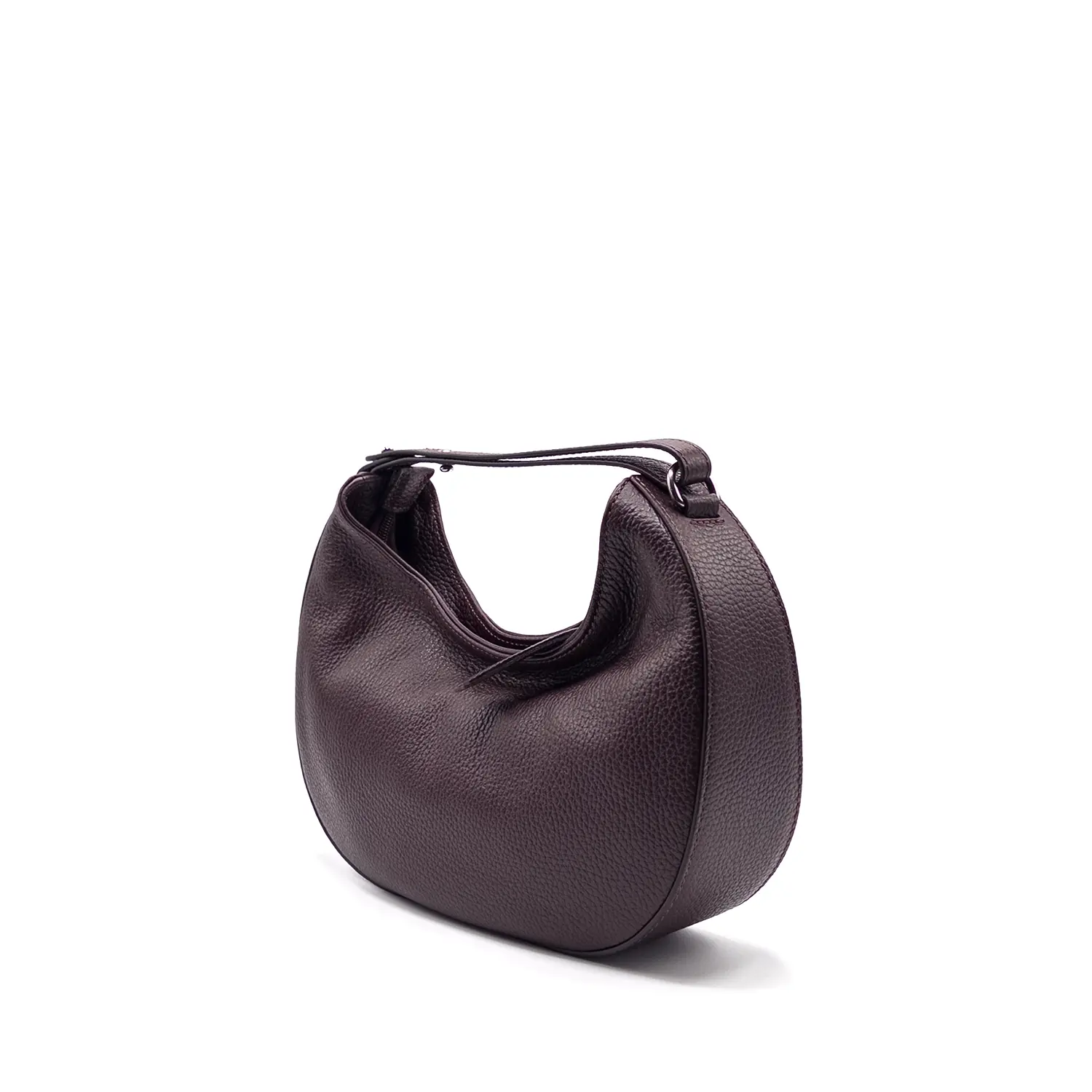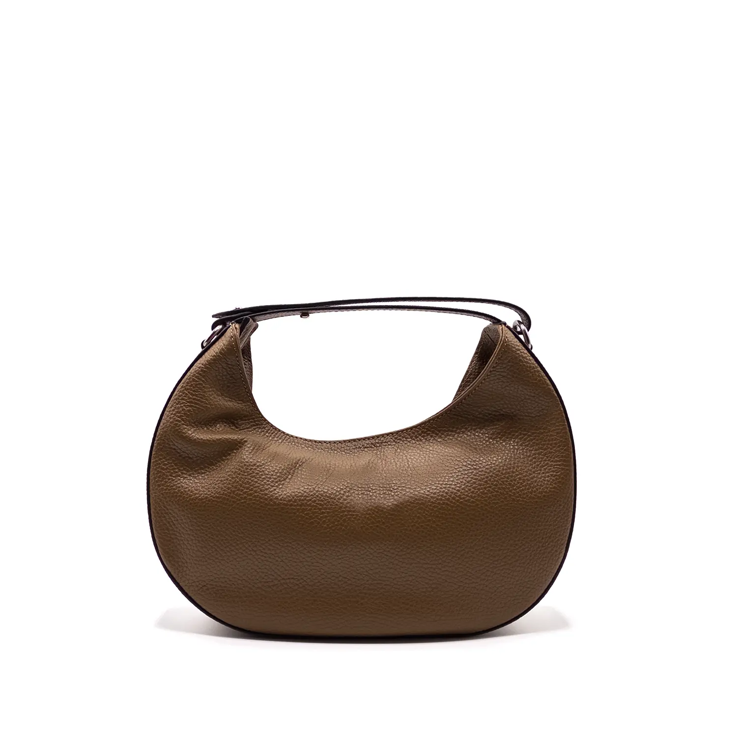 Tumbled calfskin shoulder bag with one adjustable leather handle and detachable leather shoulder strap. It features one internal flat pocket. Zipper closure.